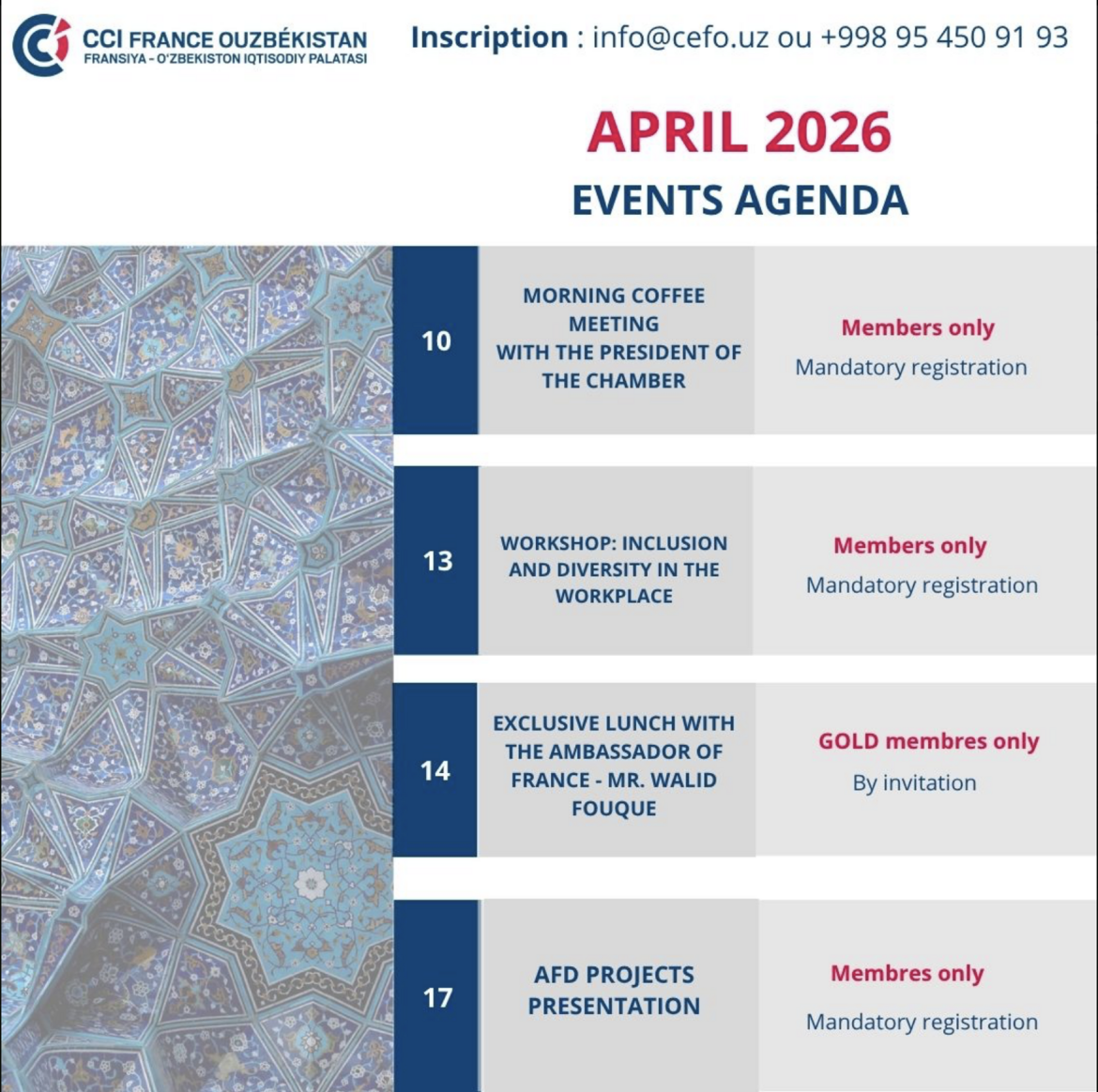 La CCIFO a pour objectif de rassembler et représenter ses membres, de développer les liens d’affaires et de soutenir les projets des entreprises françaises en Ouzbékistan, ainsi que ceux des entreprises ouzbèkes investissant dans le marché français.